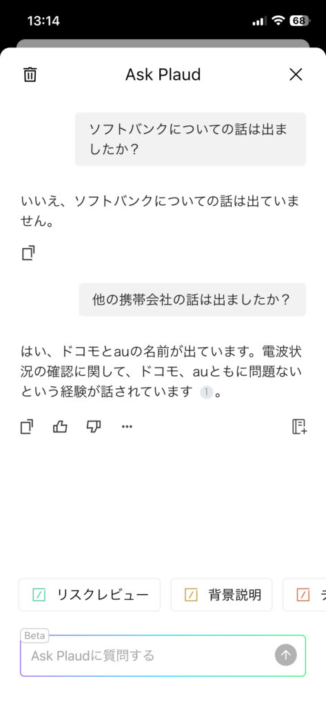 たとえば、「ソフトバンクについての話は出ましたか?」と質問すると、以下のように会議の内容に即した回答が返ってきます。