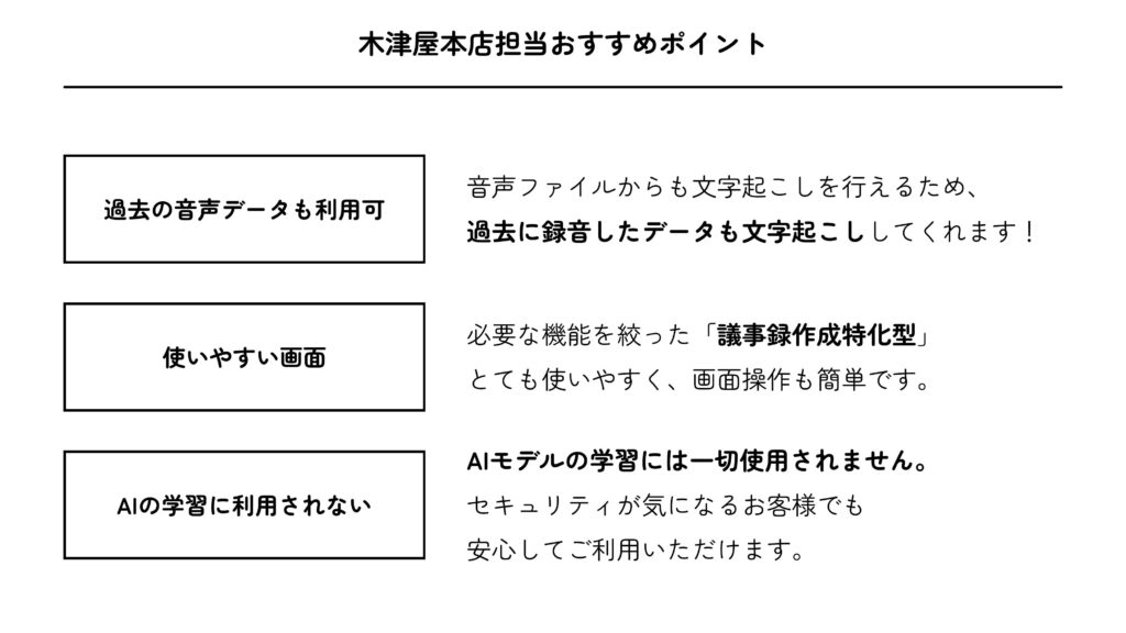 木津屋本店ではAI議事録作成ツール「AI議事録取れる君」をご提案させていただきます。